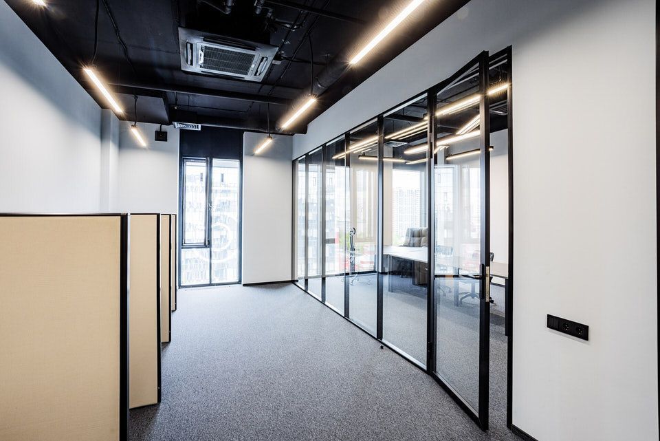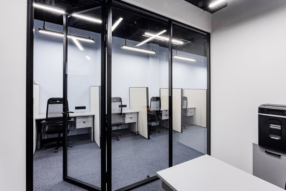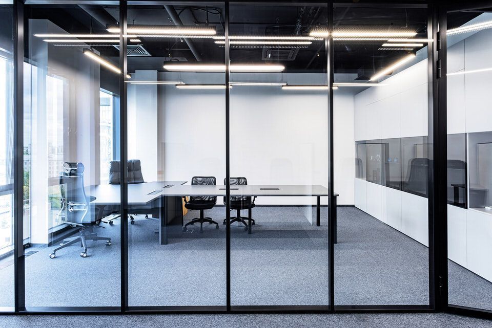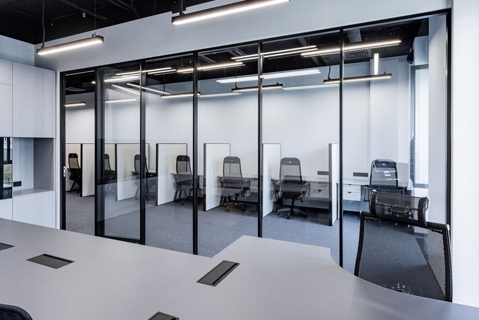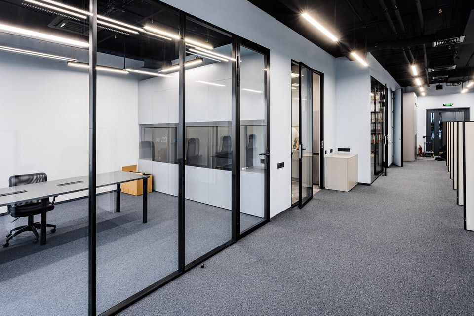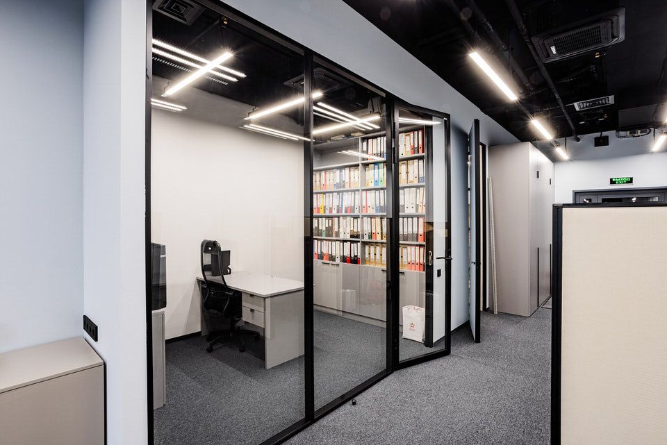 В реализации проекта были использованы стационарные перегородки серии Simplex с двойным стеклом и профилем, окрашенным в черный цвет, такой вид перегородок обладает улучшенной звукоизоляцией. В проем перегородки были изготовлены двери нестандартной высоты 2,70.