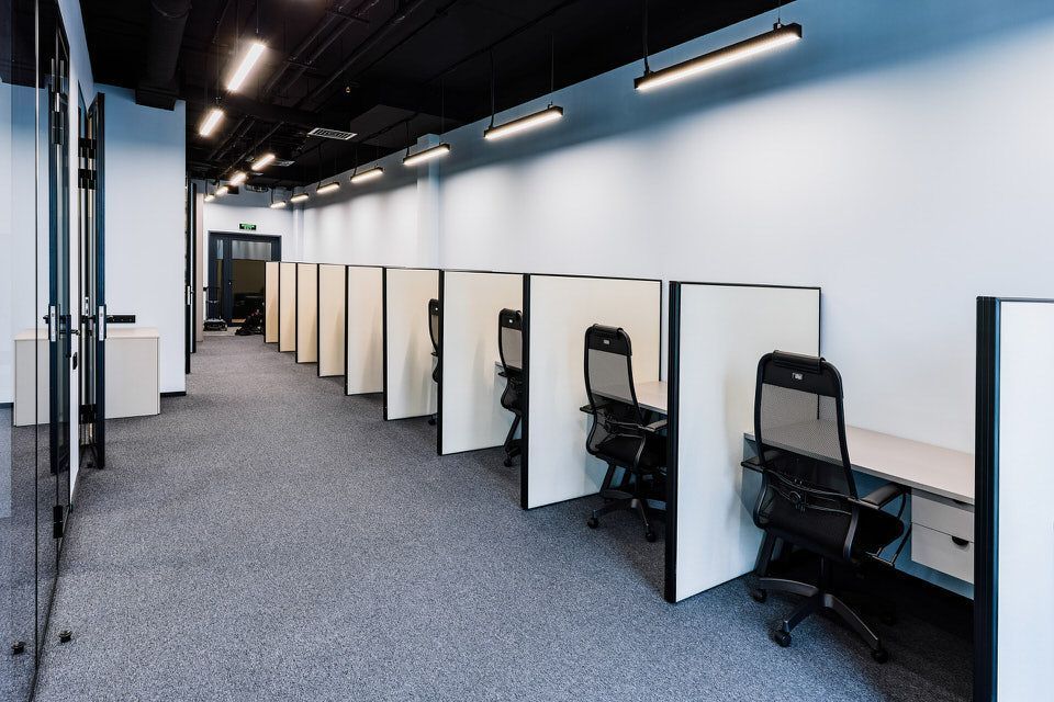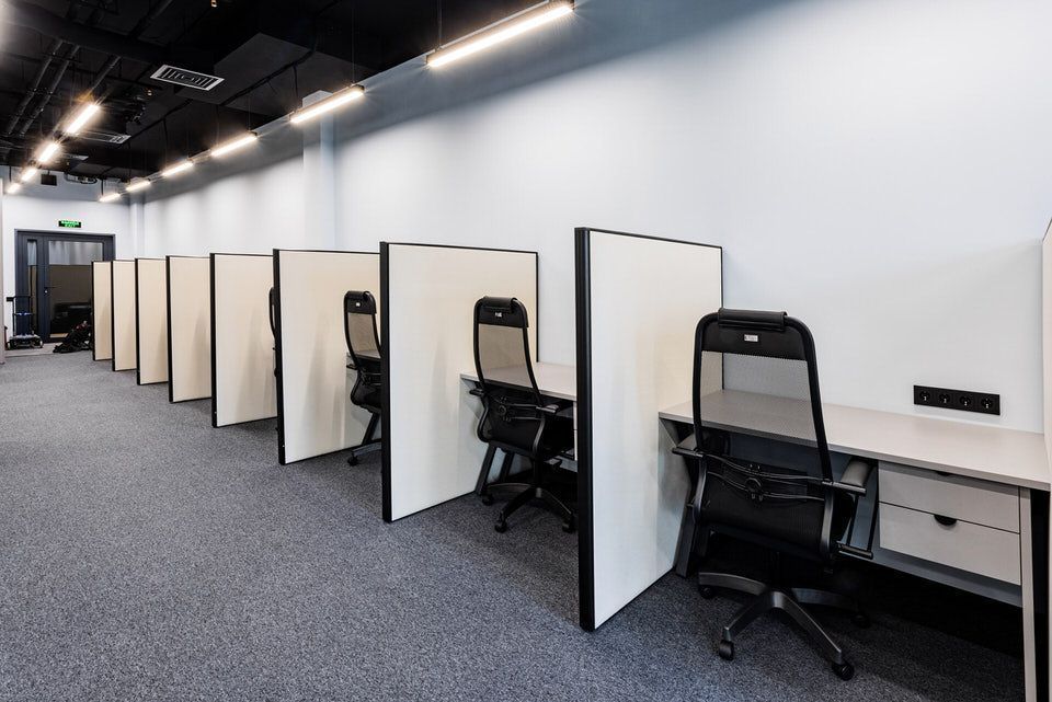 Для создания раздельных рабочих мест были использованы мобильные перегородки серии Mibile Standart с черным профилем и ЛДСП (одноцветный декор) в качестве заполнения.