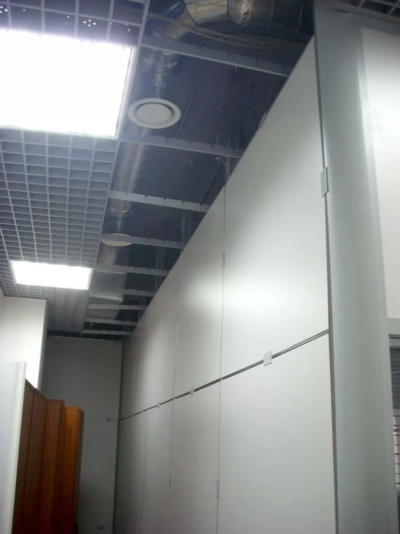 Особо следует отметить заполнение пространства над подвесным потолком на данном объекте. Эта вполне распространённая процедура в данном случае осложнялась тем, что в данном помещении был установлен подвесной потолок грильято— одна из разновидностей подвесных потолков решетчатого (ячеистого) типа. Характерное отличие данного вида потолков заключается в том, что сквозь него видны находящиеся над этим потолком конструкции. По этой причине запотолочное заполнение помимо стандартного звукоизоляционного материала Изовер, включало и установку листов Гипсовинила, внешняя (декоративная) часть которых и осталась видимой для находящихся внутри помещений людей.