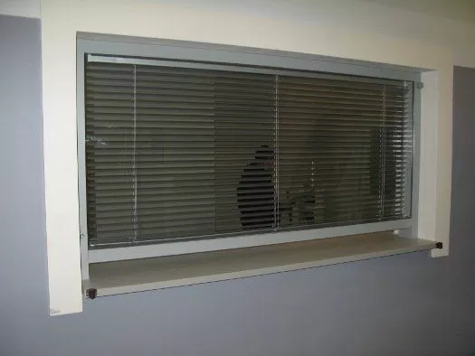 Таким образом, чтобы работнику закрыть окно, достаточно повернуть ручку управления жалюзи и поднять часть столешницы.
