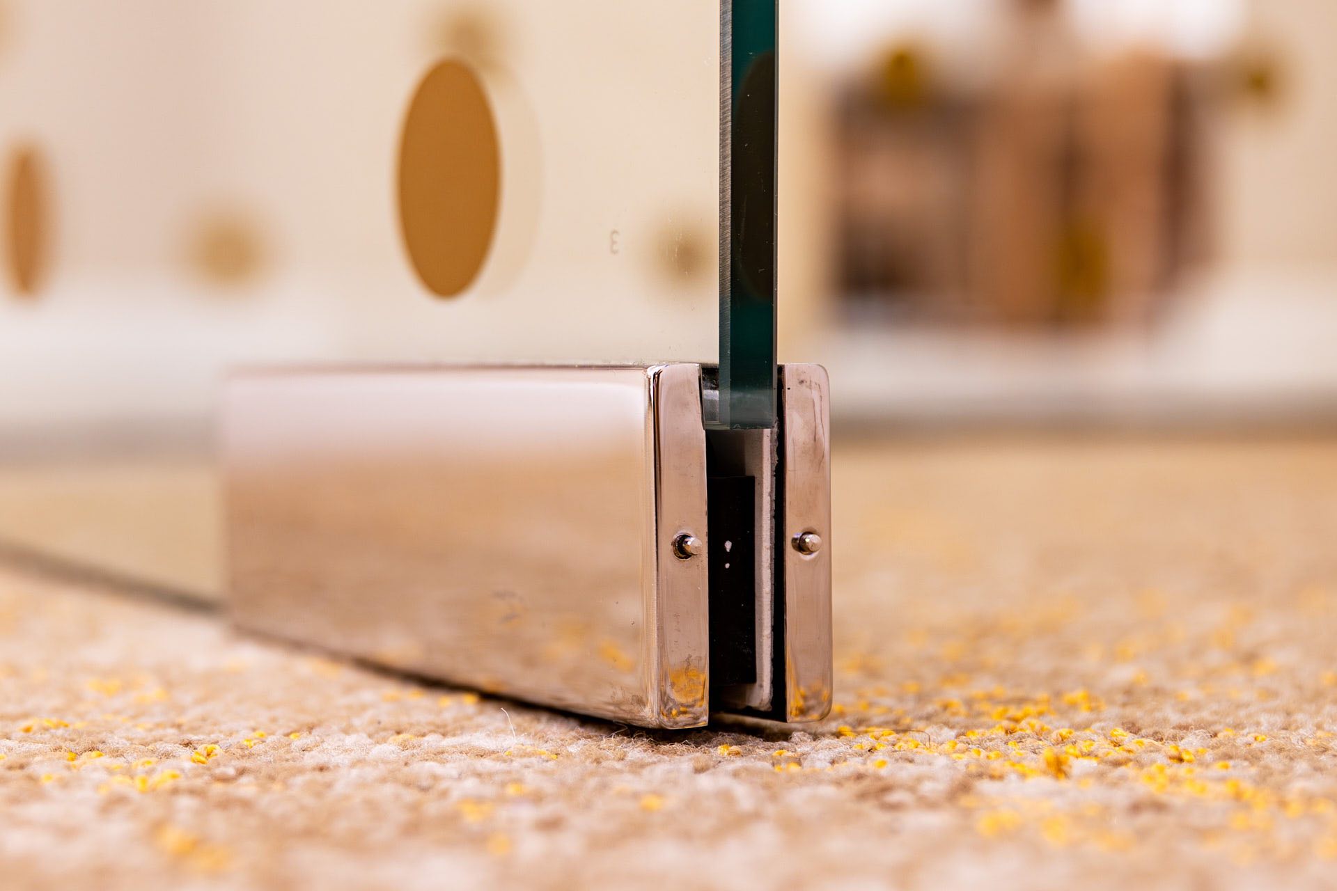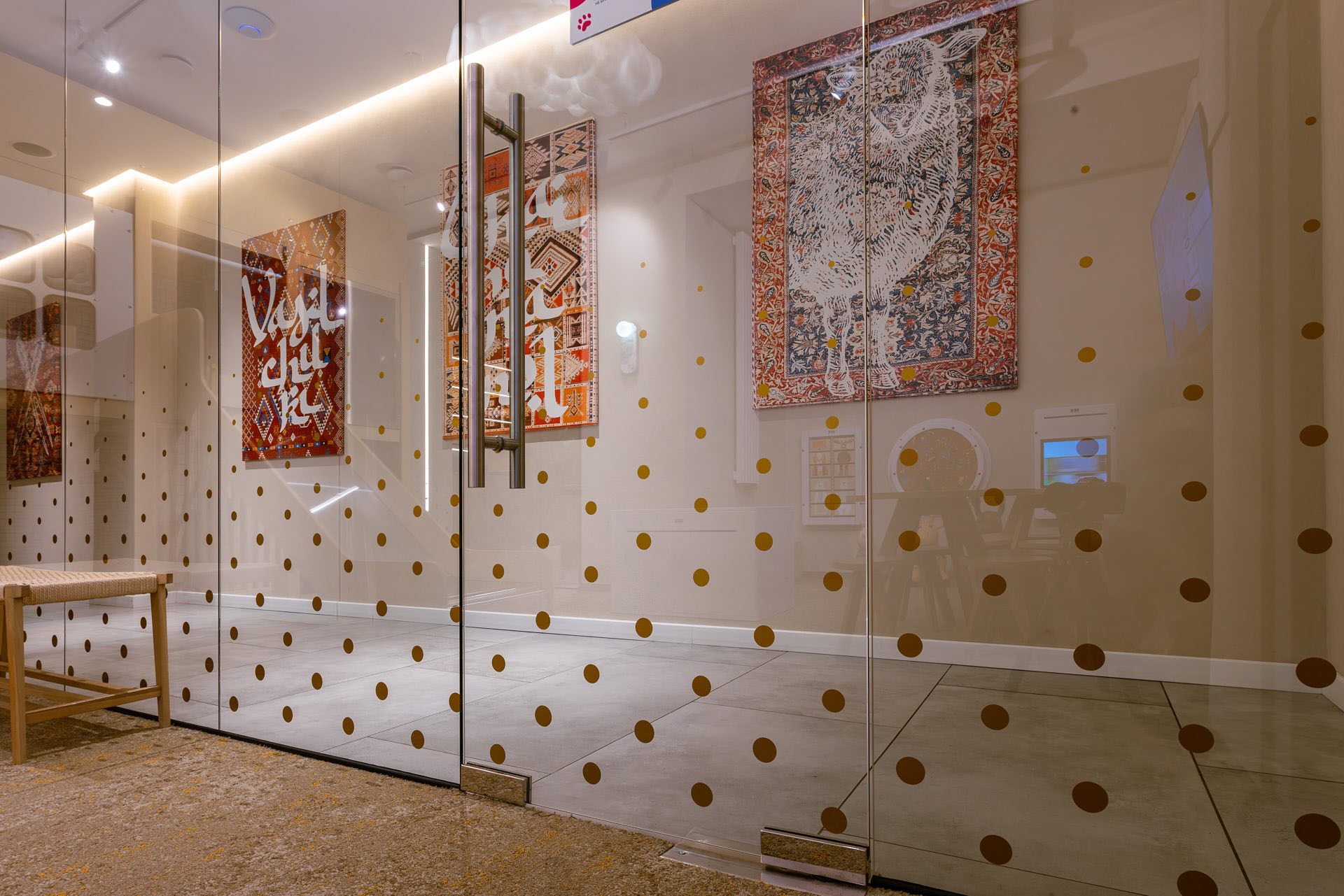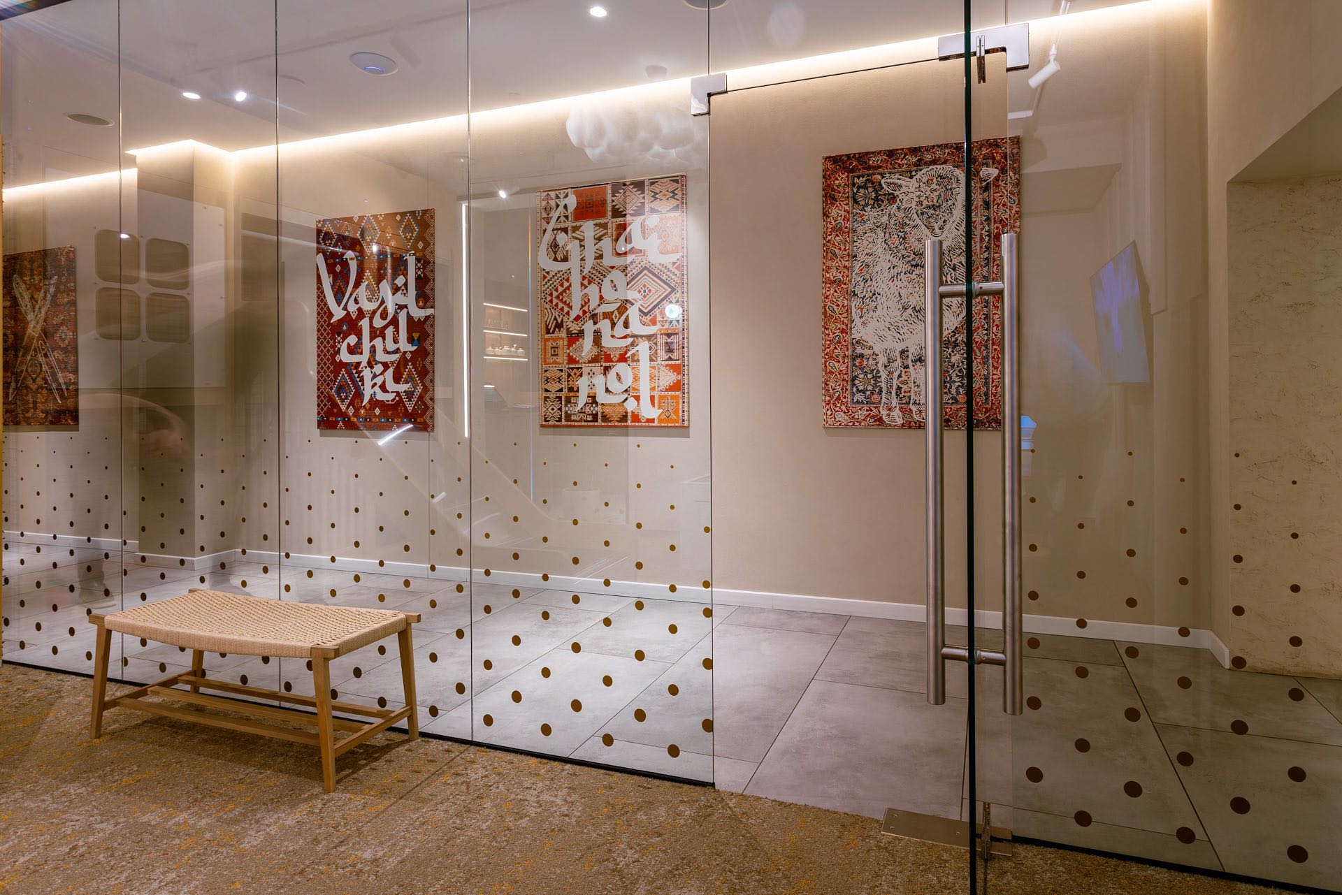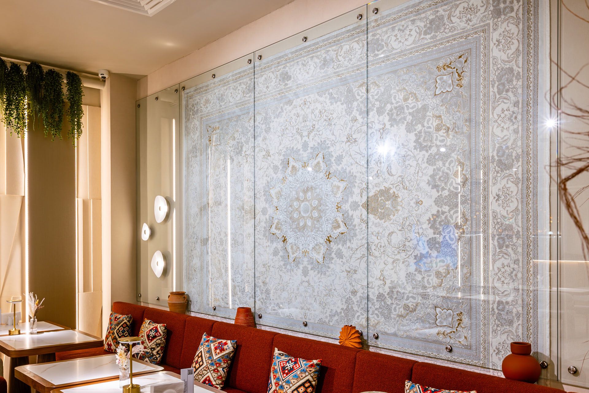 Для декорирования стены, где располагается ковер, были использованы стеклянные экраны 10 мм, которые крепились с помощью точечных креплений. На экранах были сделаны специальные вырезы для установки светильников.