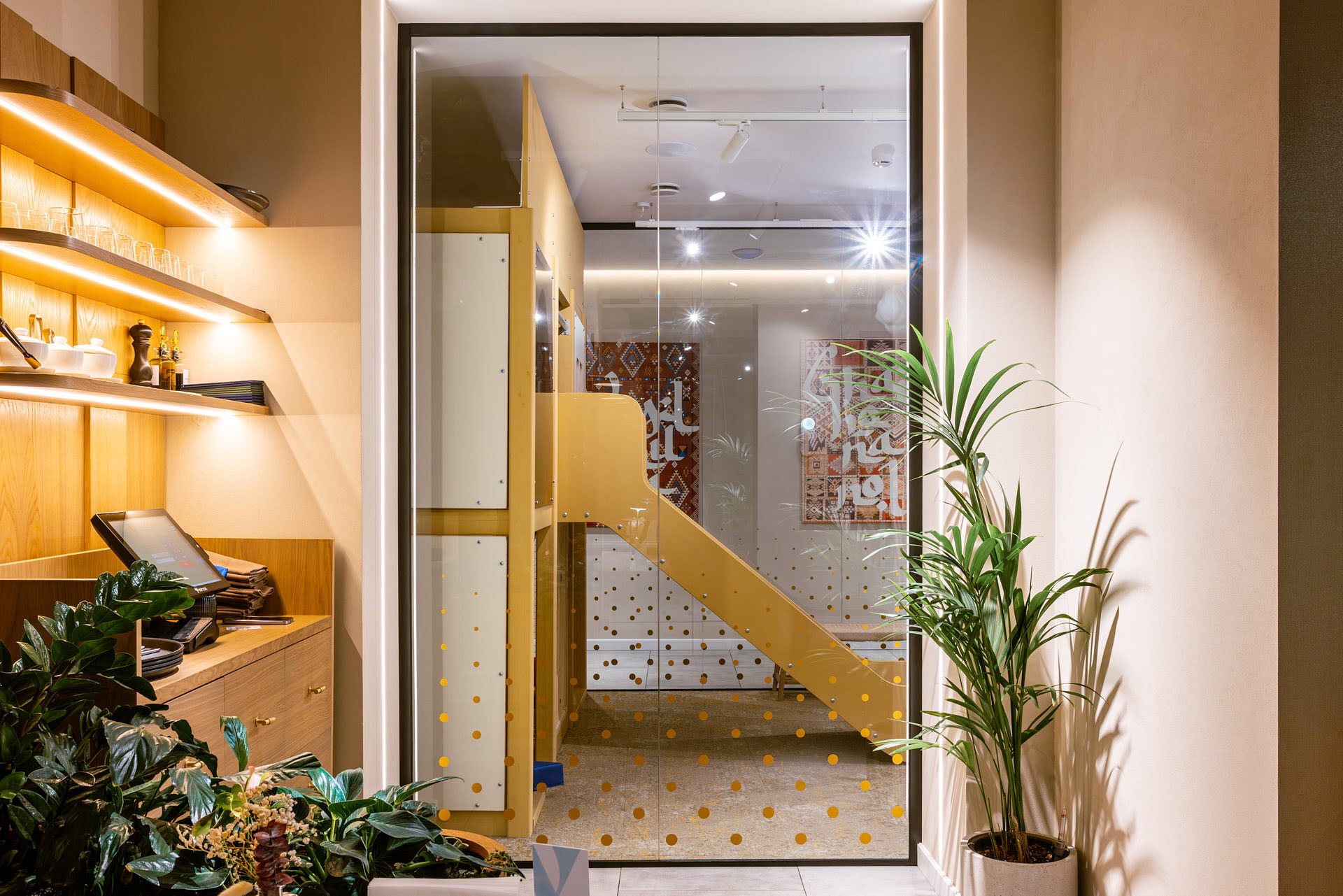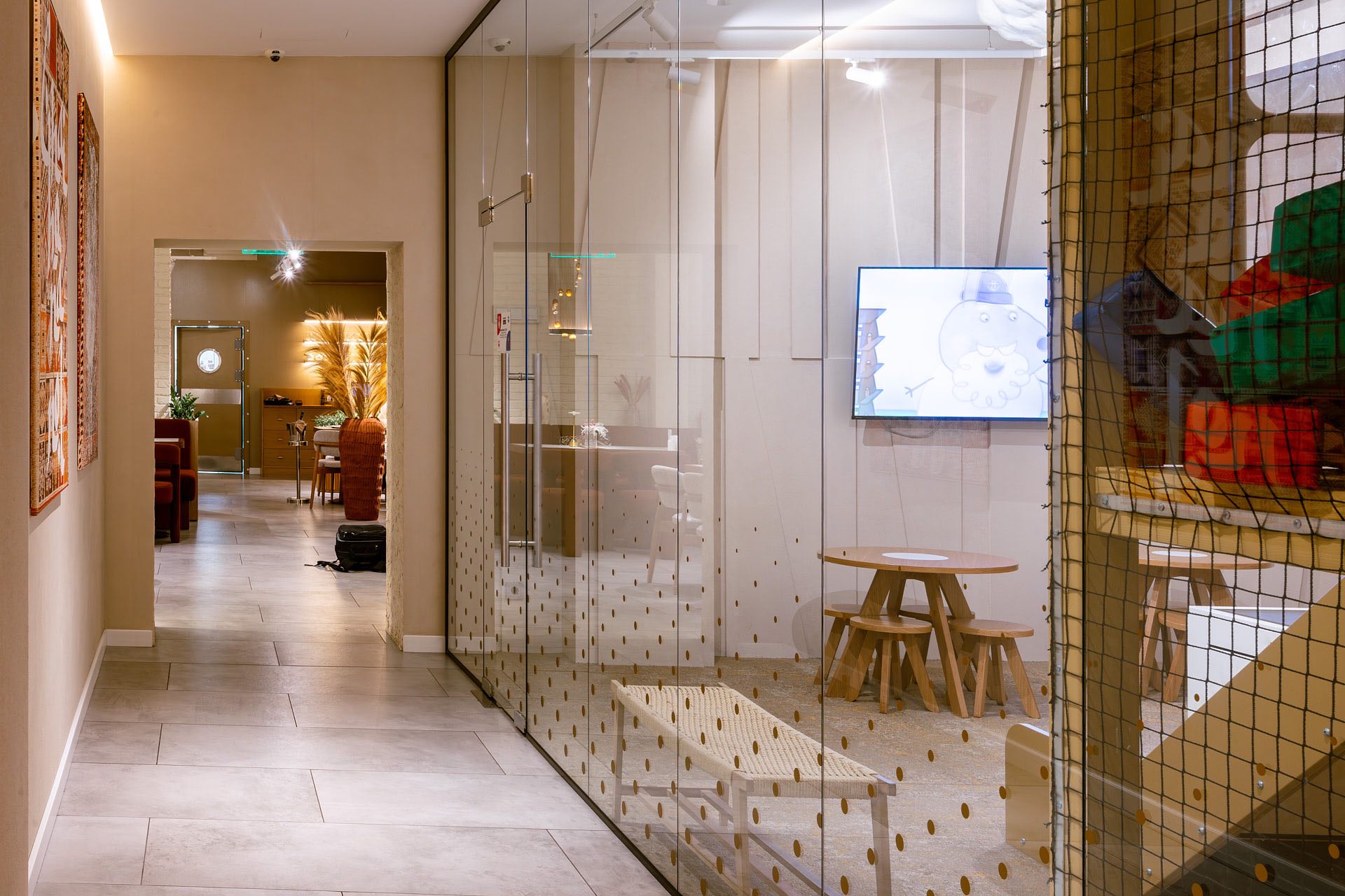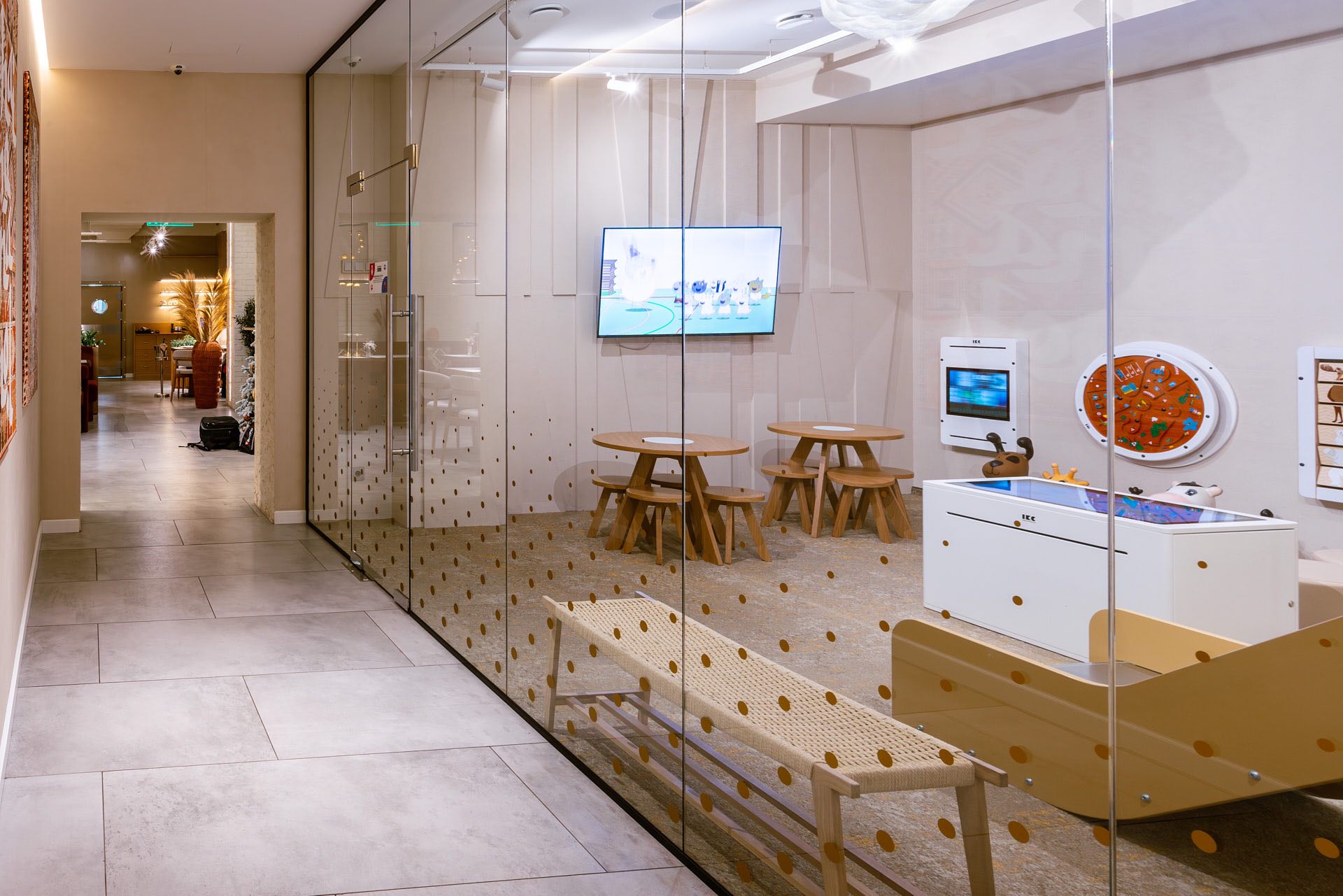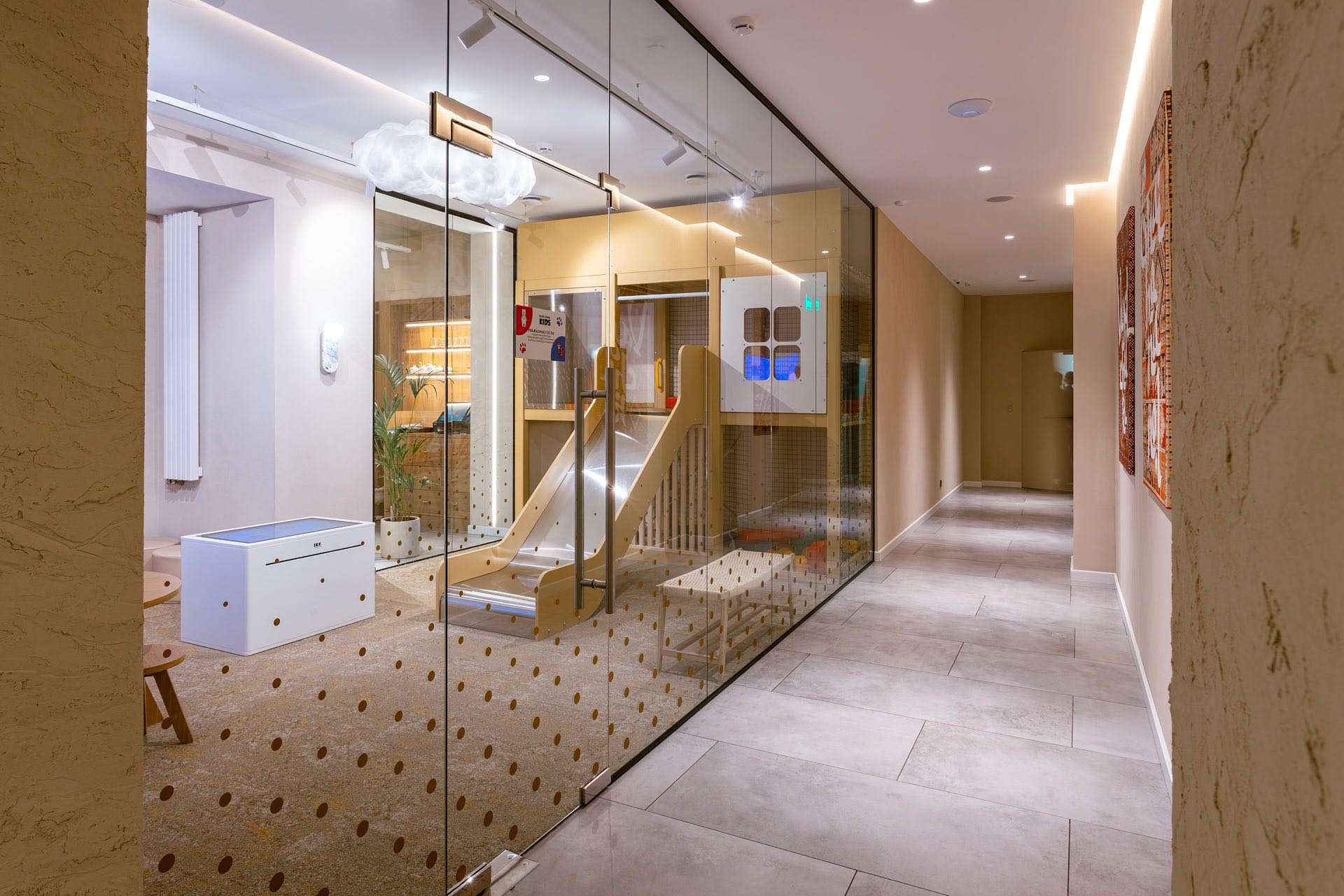 Для декорирования стены, где располагается ковер, были использованы стеклянные экраны 10 мм, которые крепились с помощью точечных креплений. На экранах были сделаны специальные вырезы для установки светильников.