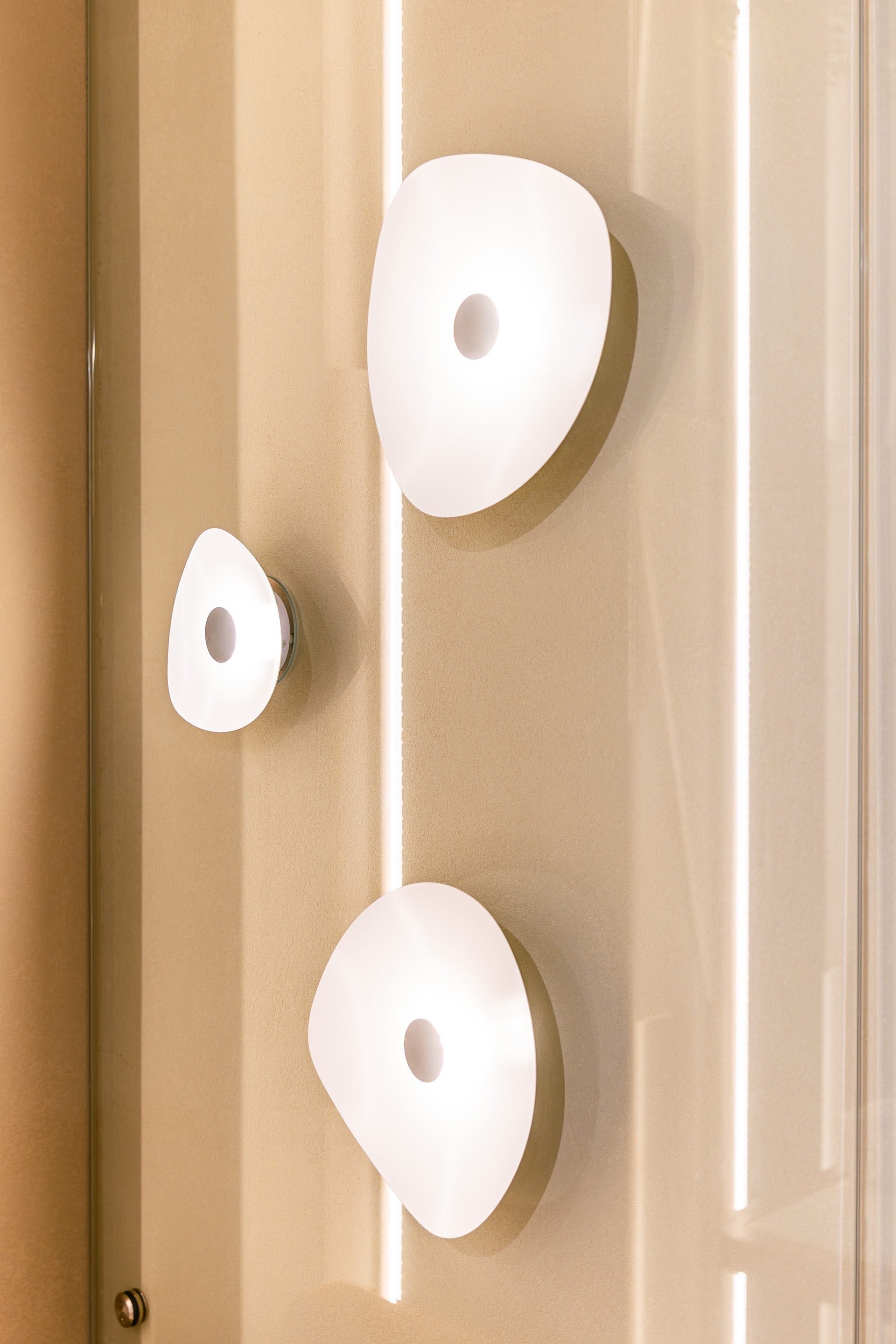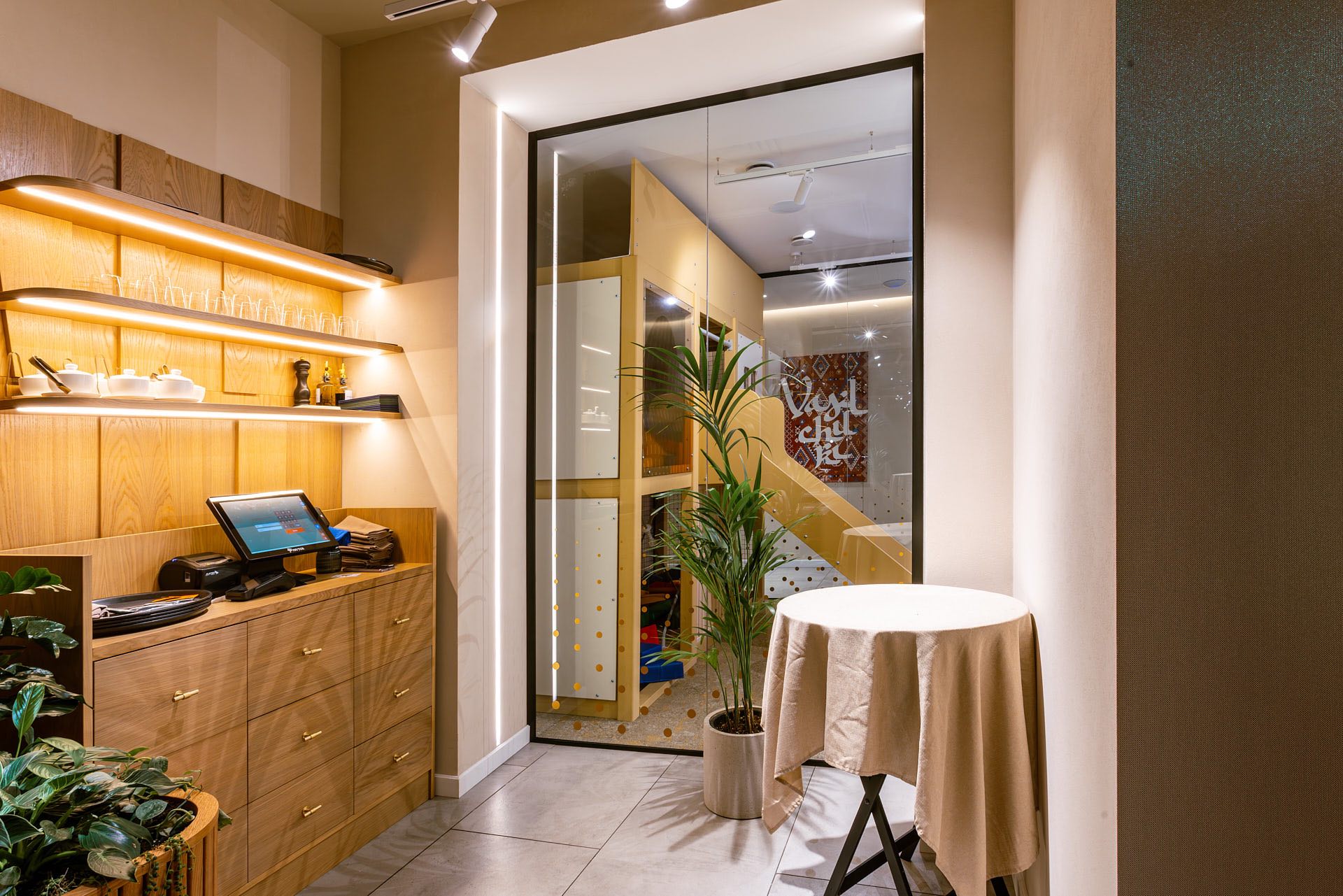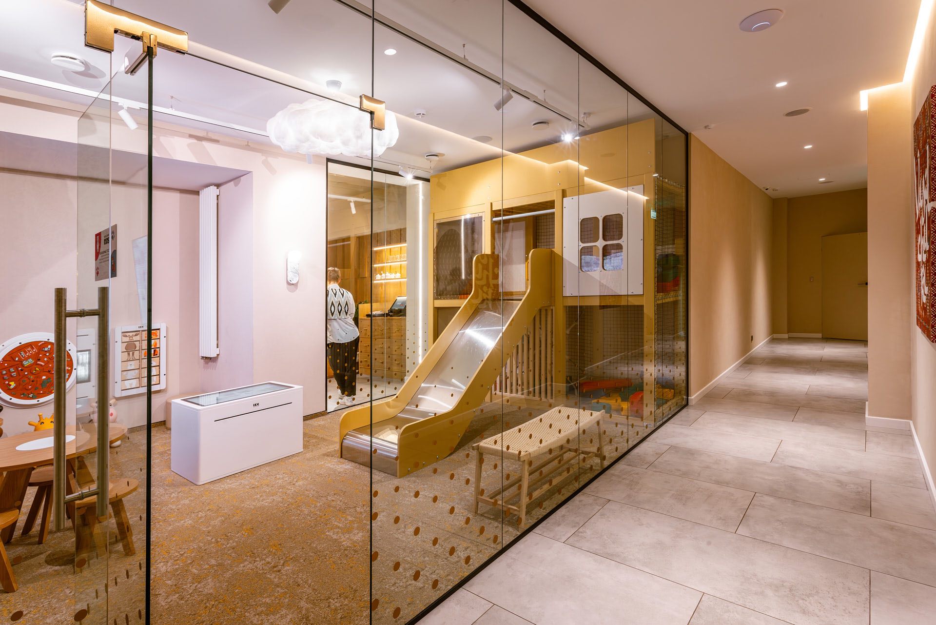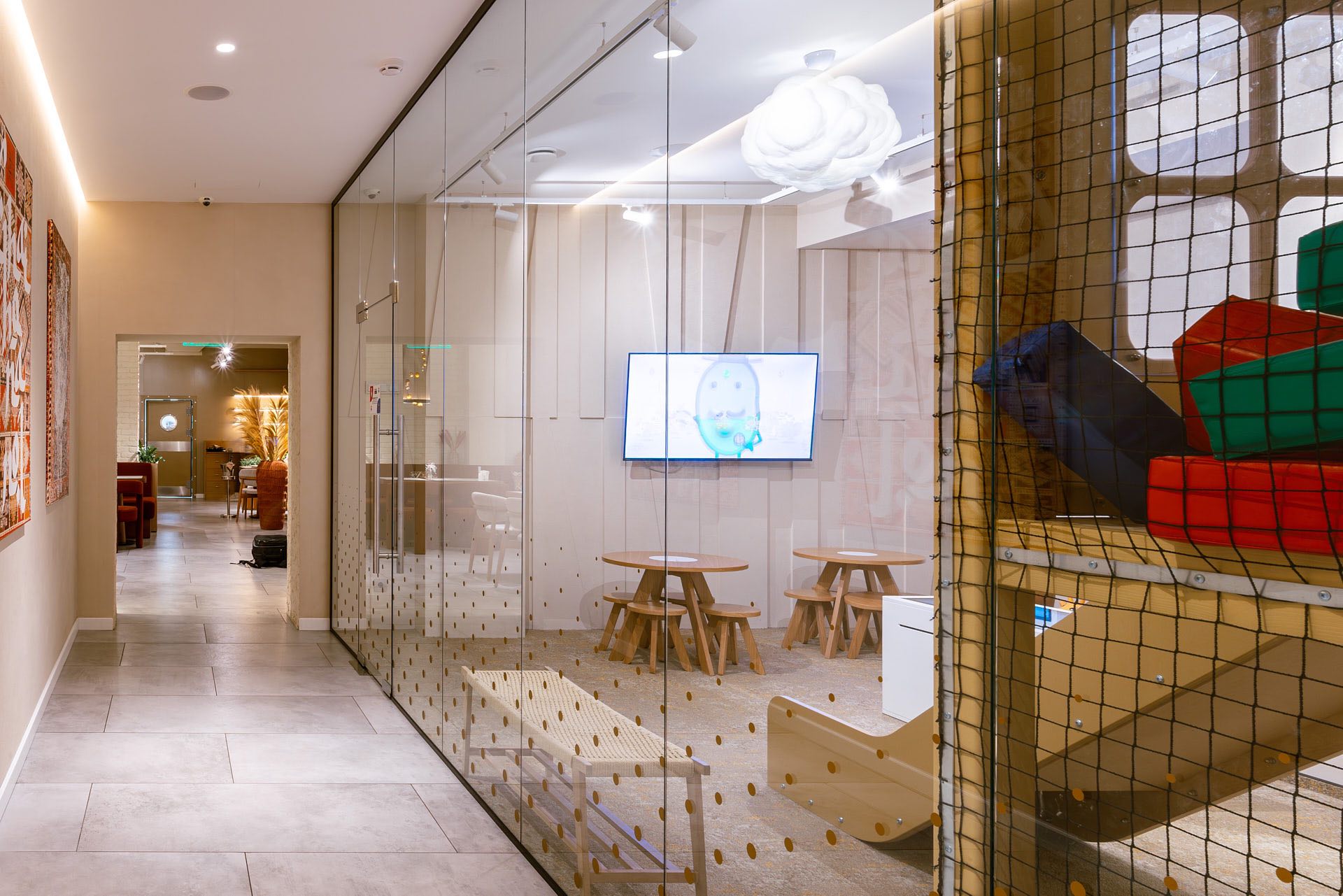 Для декорирования стены, где располагается ковер, были использованы стеклянные экраны 10 мм, которые крепились с помощью точечных креплений. На экранах были сделаны специальные вырезы для установки светильников.